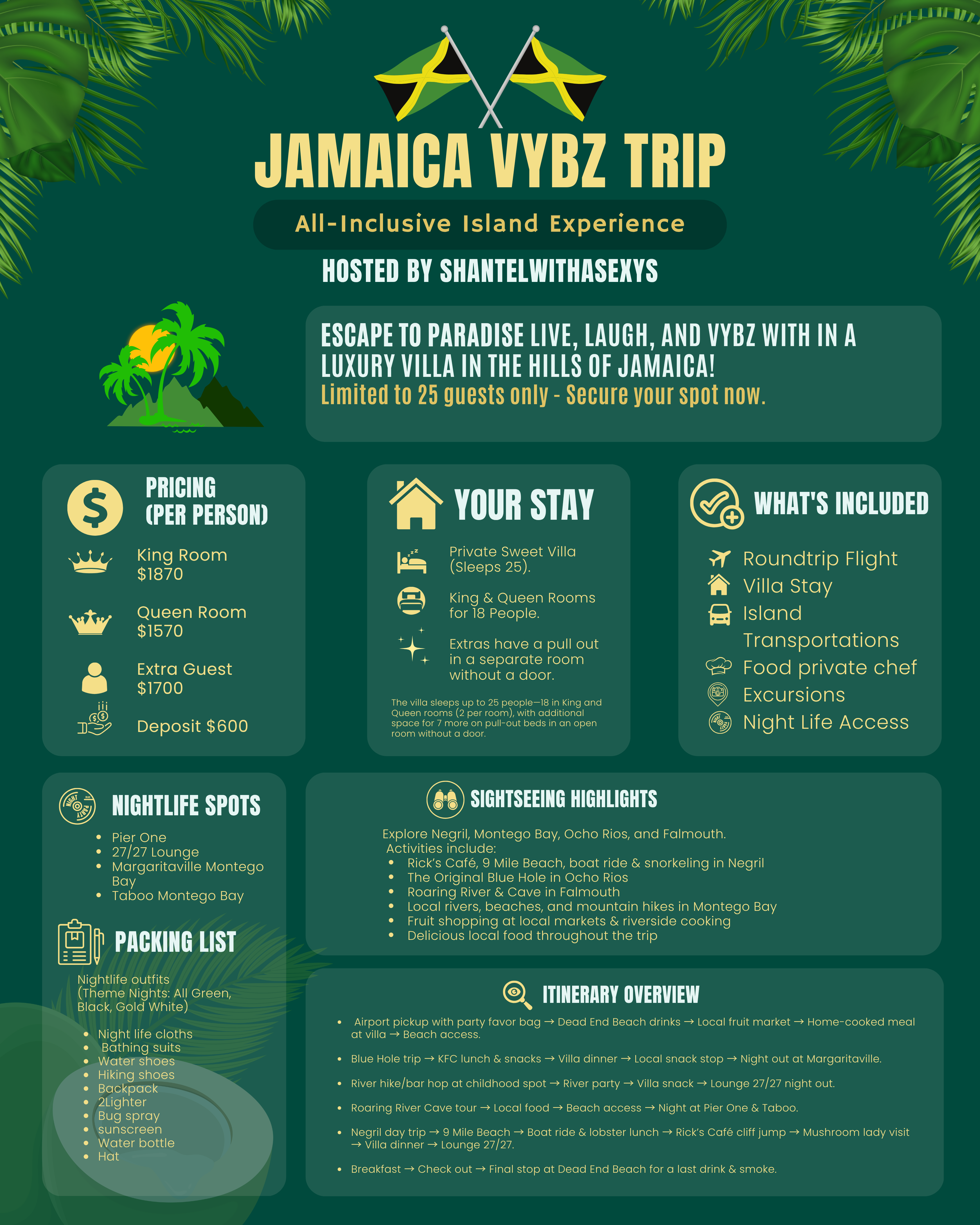All inclusive trip everything paid for from flights, villa, transportation, private chef’s, excursions, Nightlife, and travel back.